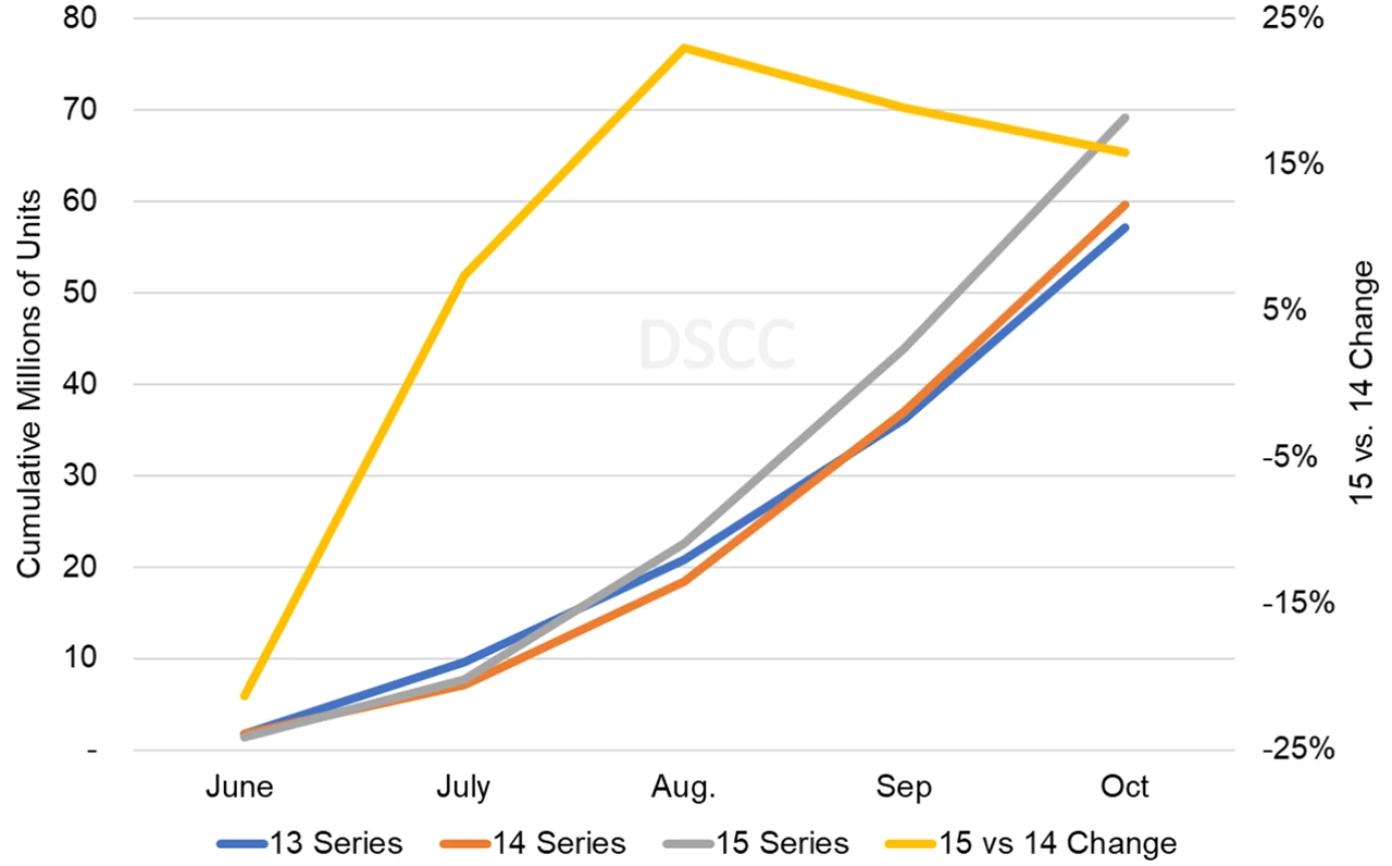 Испораките на панелите за актуелната iPhone 15 серија се зголемени за 16% во споредба со бројот на панели испорачани за iPhone 14 моделите во истиот период до октомври, според податоците објавени од консултантот за синџирот на снабдување со екрани Display Supply Chain Consultants – DSCC.