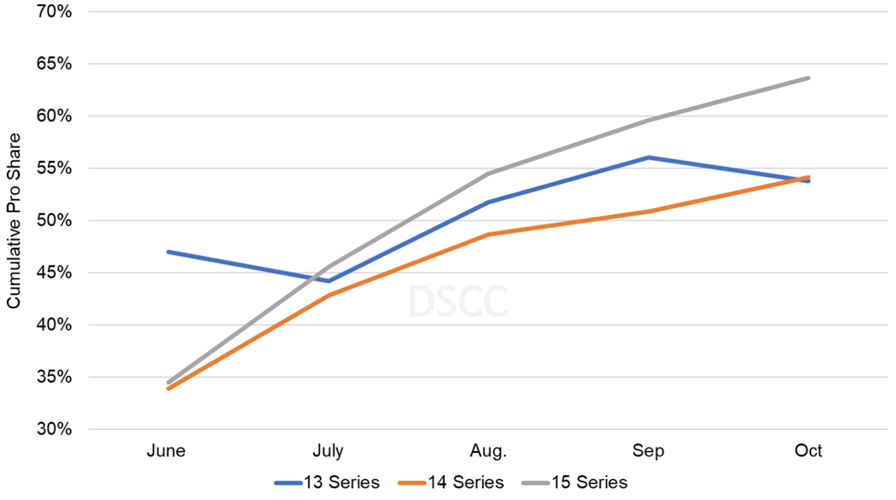 Во основа, според податоците на DSCC, iPhone Pro моделите оваа година се попопуларни од кога било. Директорот за истражување во DSCC, Дејвид Наранџо вели: „Испораките на панели за iPhone 15 Pro моделите сочинуваа поголем дел од iPhone 14 Pro и iPhone 13 Pro моделите во периодот од јуни до октомври. На кумулативна основа, од јуни до октомври, iPhone 15 Pro моделите имаа удел од 64%, во споредба со уделот од 54% за iPhone 14 и iPhone 13 серијата.