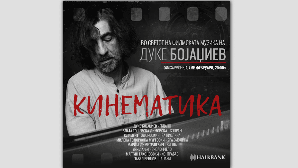 „Кинематика“ или „Во светот на филмската музика на Дуке Бојаџиев“ е насловот на концертот што Дуке Бојаџиев ќе го одржи на 7 февруари во Македонската филхармонија. Концертот е во чест на 20 години интернационална кариера. Овој целовечерен концерт ќе ги пренесе слушателите низ најзначајните моменти од филмското творештво на Бојаџиев, создавајќи емотивно патување кое ја истакнува убавината на филмската музика и нејзината моќ да ги допре најдлабоките делови од човечката душа.