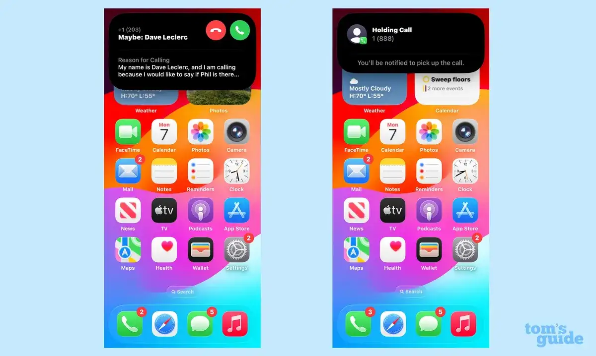 Апликациите Phone и FaceTime добиваат нови функции, како филтрирање на повици и опцијата Hold Assist. Првата овозможува препознавање на непознати повикувачи пред да одлучите дали ќе одговорите, додека втората ја следи линијата додека сте на чекање и ве известува кога ќе се јави операторот. FaceTime има нов изглед со приказ на контакти и поддршка за превод во живо, достапен само на најновите модели.