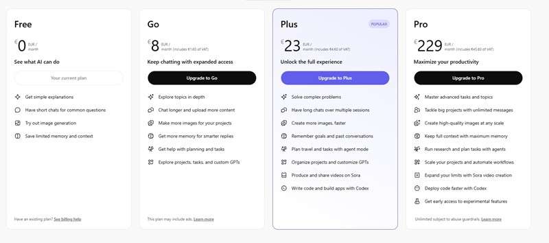 За разлика од оние што плаќаат 23 евра за Plus претплата, корисниците на основниот пакет нема да имаат пристап до видео алатката Sora, системот за програмирање Codex, ниту пак до побрз пристап за изработка на слики, а покрај тоа, во блиска иднина во интерфејсот ќе почнат да гледаат и реклами. Но, во споредба со бесплатниот пакет услуги, претплатата Go ќе нуди дури 10 пати поголеми лимити за „обични“ разговори со моделот GPT-5.2 Instant, што веројатно за оние кои сакаат да „муабетат“ со него ќе биде и најголемата предност на оваа претплата.