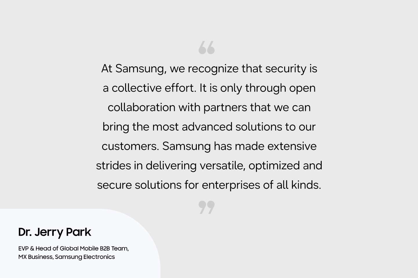 „Во компанијата “Samsung“, на безбедноста не гледаме како на поединечен напор, туку како на заедничка одговорност. Само преку отворена соработка со партнерите можеме да им ги понудиме на нашите корисници најнапредните решенија. Во текот на нашата работа во “Samsung“, остваривме значителен напредок во развојот на флексибилни, оптимизирани и безбедни решенија прилагодени за претпријатија од сите големини и профили.